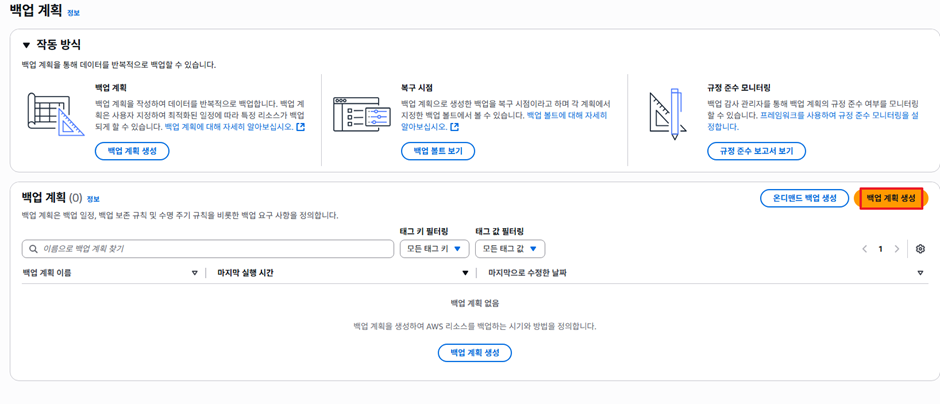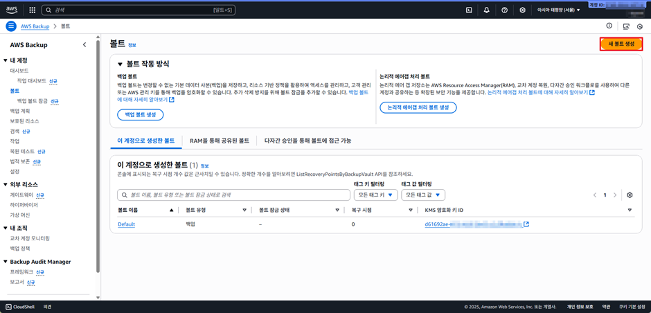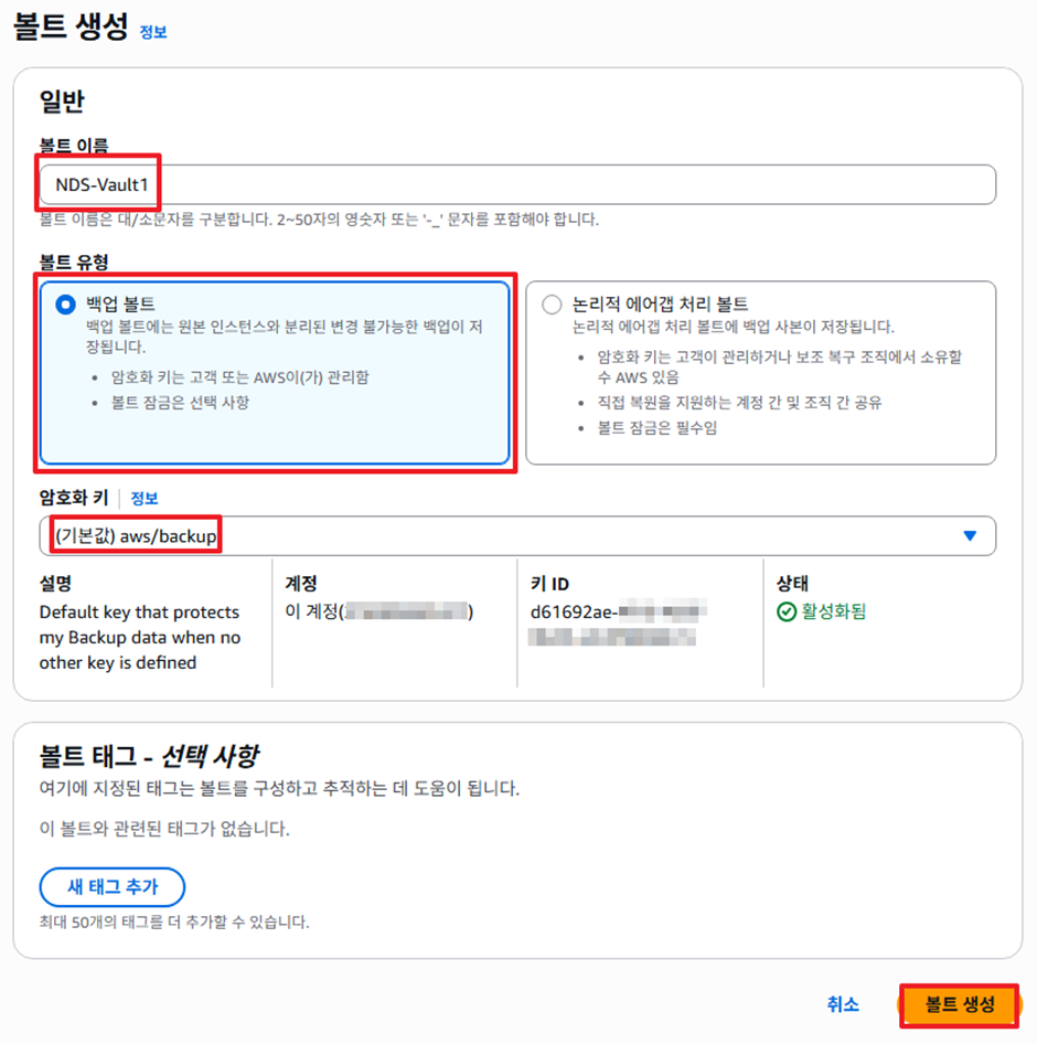 -> 볼트 이름, 암호화키(aws/backup) 선택 후 생성.