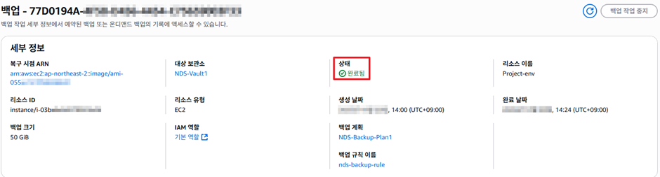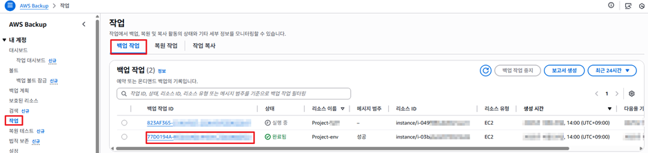 -> 백업 플랜으로 인해 백업이 수행될 경우 AWS Backup 작업 항목을 통해 상태 확인 가능.