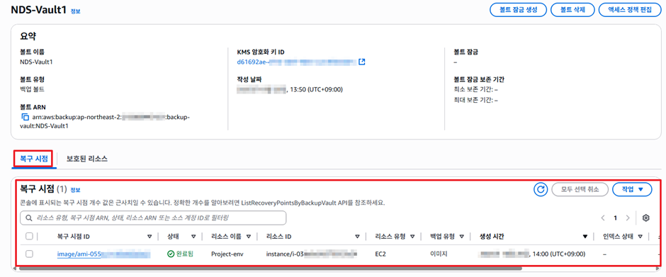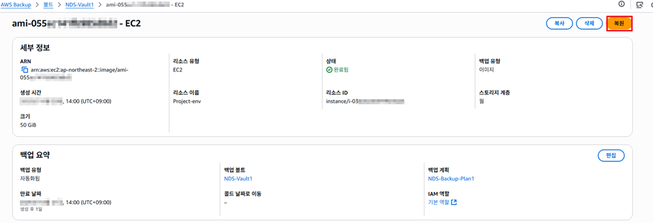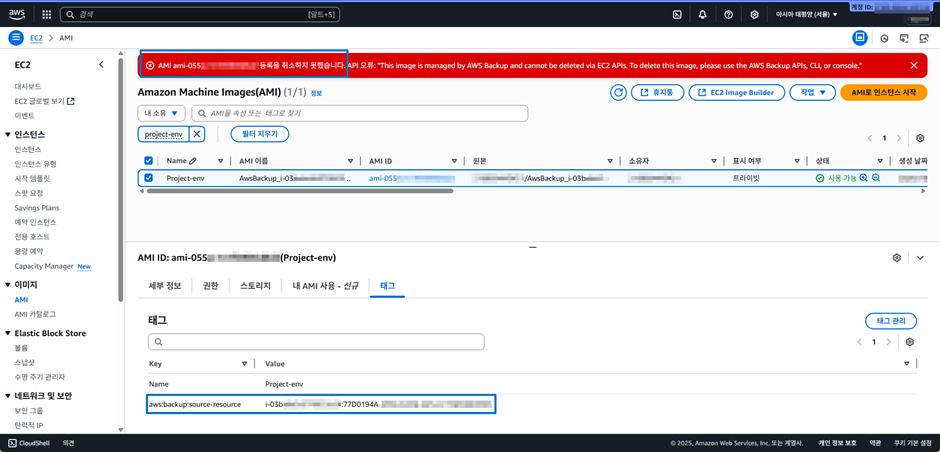 -> * EC2의 경우 AMI 형태로 이미지 백업을 수행하여 EC2 화면내 AMI가 확인 되나 제거가 불가능하고 AWS Backup 볼트에서 중앙 제어됨.