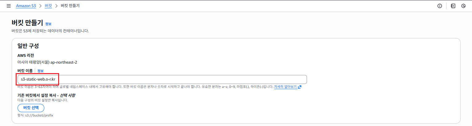 저의 경우 후속글에서 원하는 도메인과 정적 웹 사이트를 연결하기 위해 미리 구입한 도메인과 동일한 이름으로 버킷을 생성하였습니다.