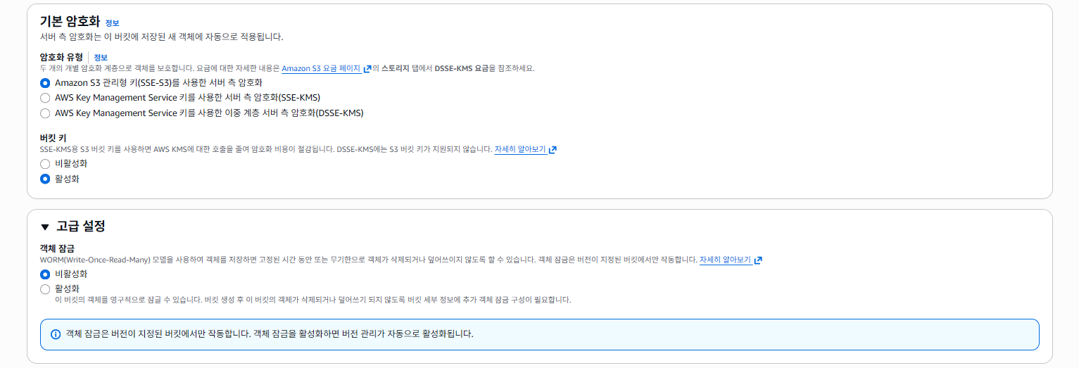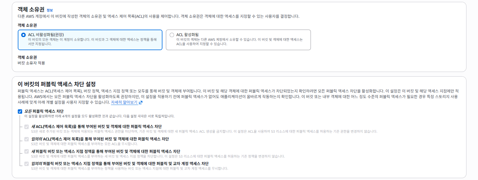 버킷 이름을 제외한 아래 나머지 설정값은 기본값으로 그대로 두고 진행하도록 하겠습니다.