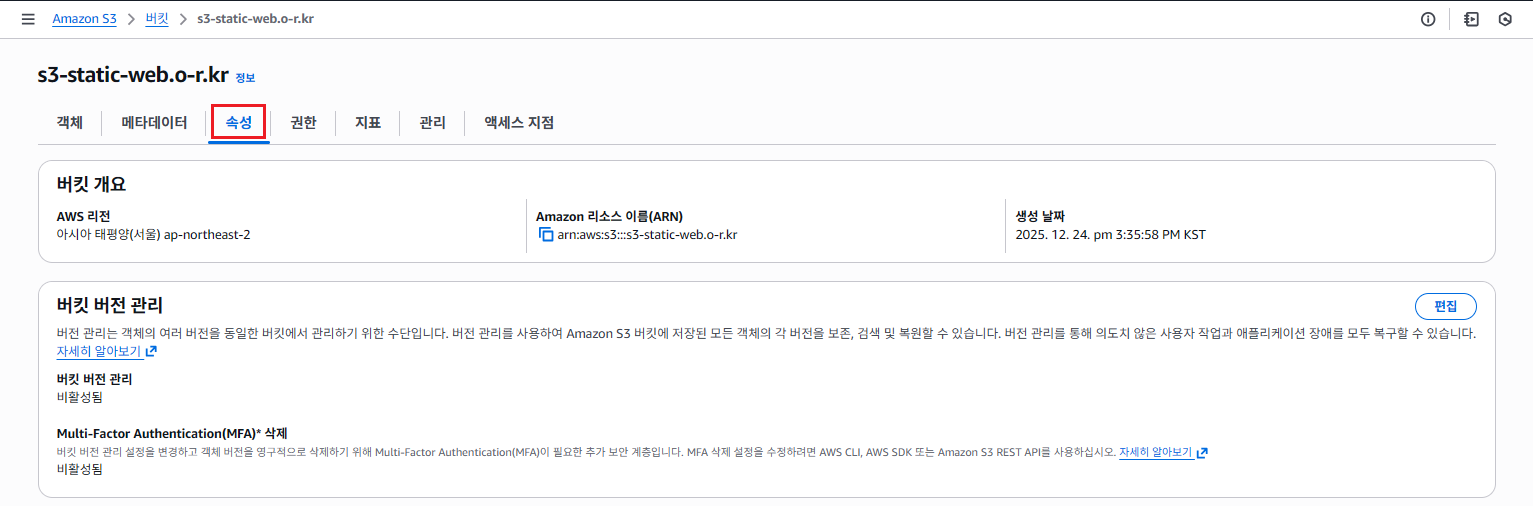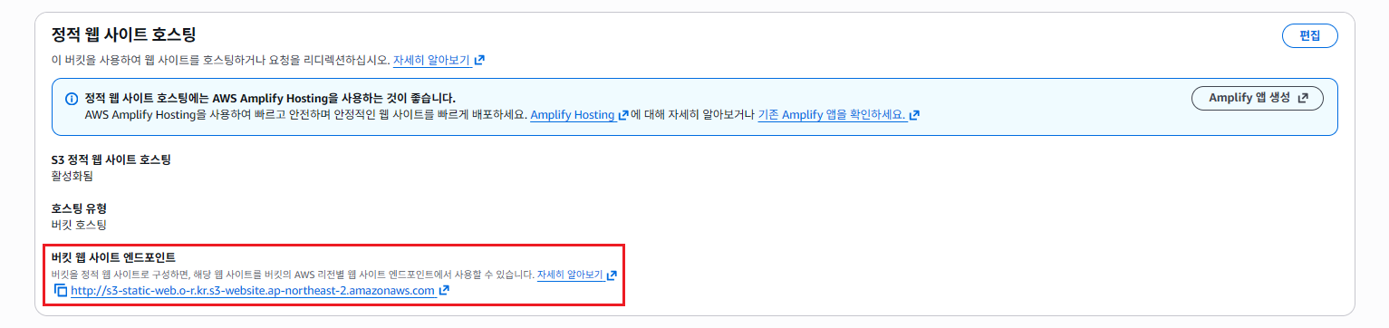 🪣 1. 버킷 내 [속성(Properties)] 를 선택 후, 페이지 하단의 정적 웹 사이트 호스팅(Static website hosting)에서 버킷 웹 사이트 엔드포인트(Bucket website endpoint)를 선택합니다.