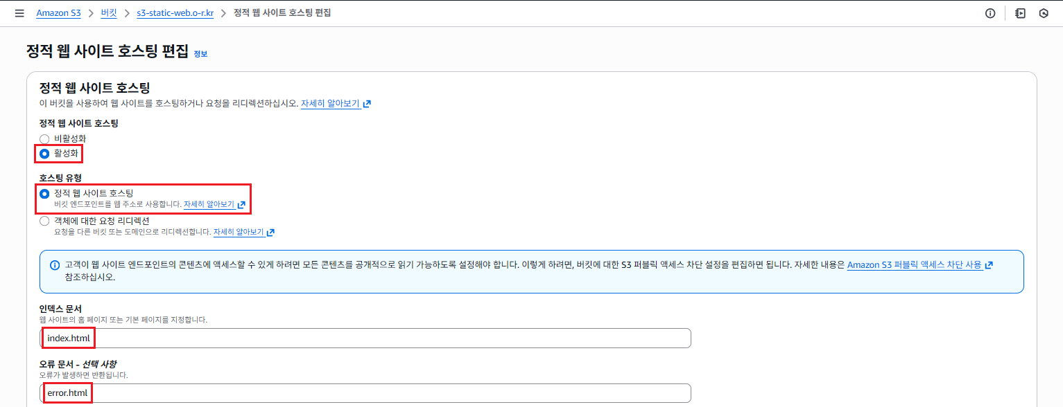 🪣 3. [정적 웹 사이트 호스팅] 값을 ‘활성화’로 선택하고 [호스팅 유형] 은 ‘정적 웹 사이트 호스팅’을 선택합니다.