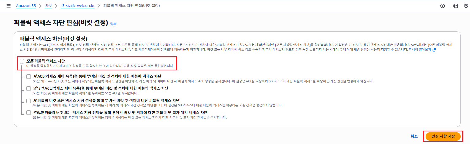 🪣 2. 모든 퍼블릭 액세스 차단(Block all public access)을 선택 취소하고 변경 사항 저장(Save changes)을 선택합니다.