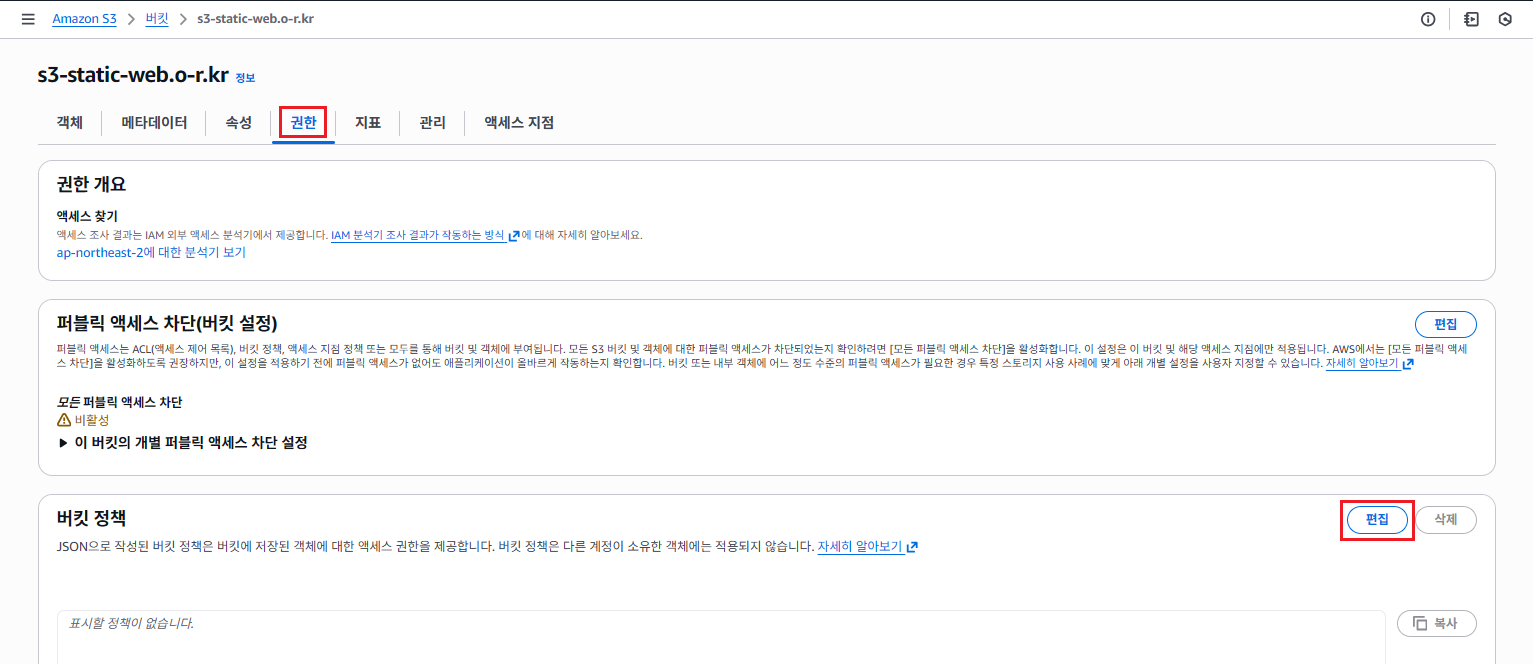 🪣 1. 버킷의 [권한(Permissions)] 선택 후, 버킷 정책(Bucket Policy)에서 편집(Edit)을 선택합니다.