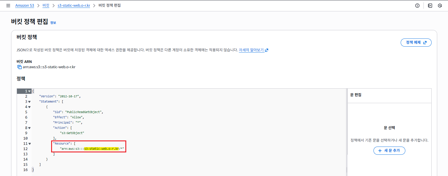 🪣 2. 웹 사이트에 대한 퍼블릭 읽기 액세스 권한을 부여하기 위해 아래 버킷 정책을 복사한 후 버킷 정책 편집기에 붙여 넣습니다. (⚠️Resource 내 ‘Bucket-Name’ 값을 버킷 이름으로 수정 필수!)