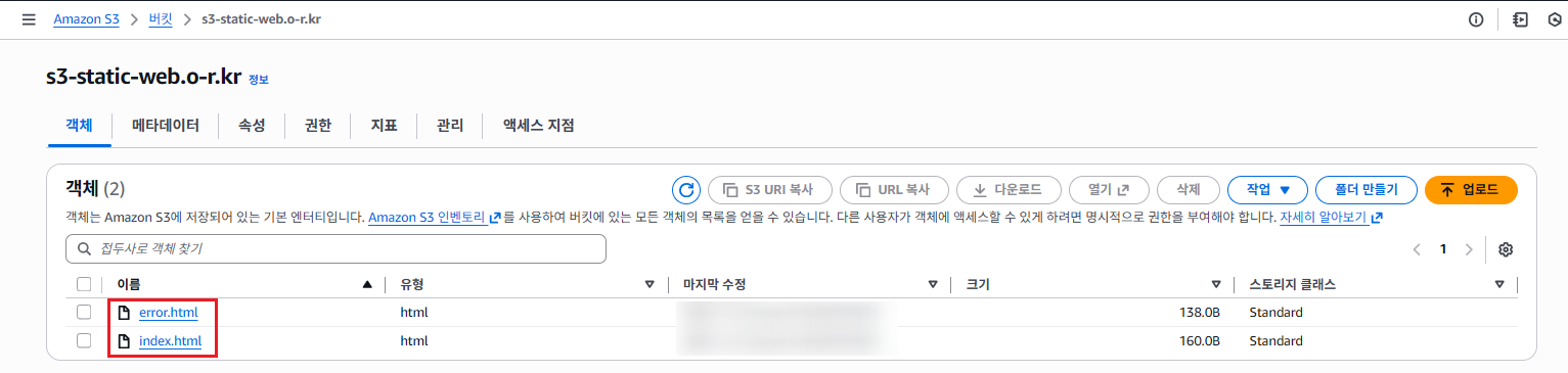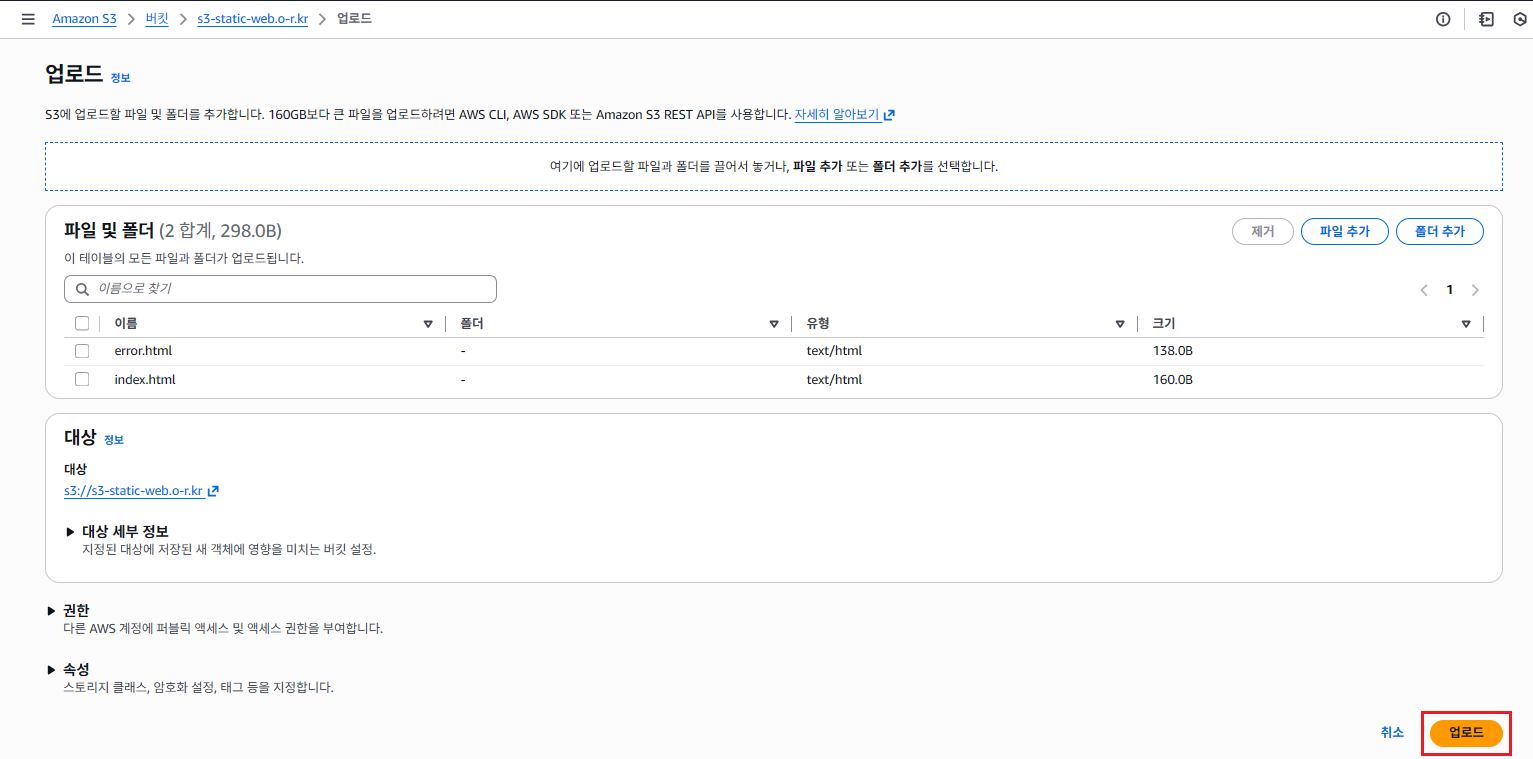 🪣 1. 버킷용 정적 웹 사이트 호스팅을 활성화할 때 표시될 인덱스 문서와 오류 문서 파일을 구성한 뒤 버킷에 업로드 합니다.