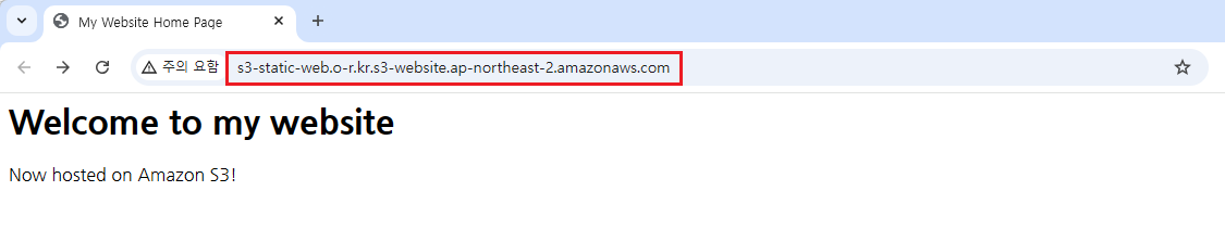 다만, 마지막으로 확인한 정적 웹 사이트를 자세히 보시면 HTTP 연결만 지원하고 도메인에 버킷명이 그대로 노출되기 때문에 후속글에서는 원하는 도메인과 구성한 정적 웹 페이지를 연결해보는 방법에 대해 알아보도록 하겠습니다.